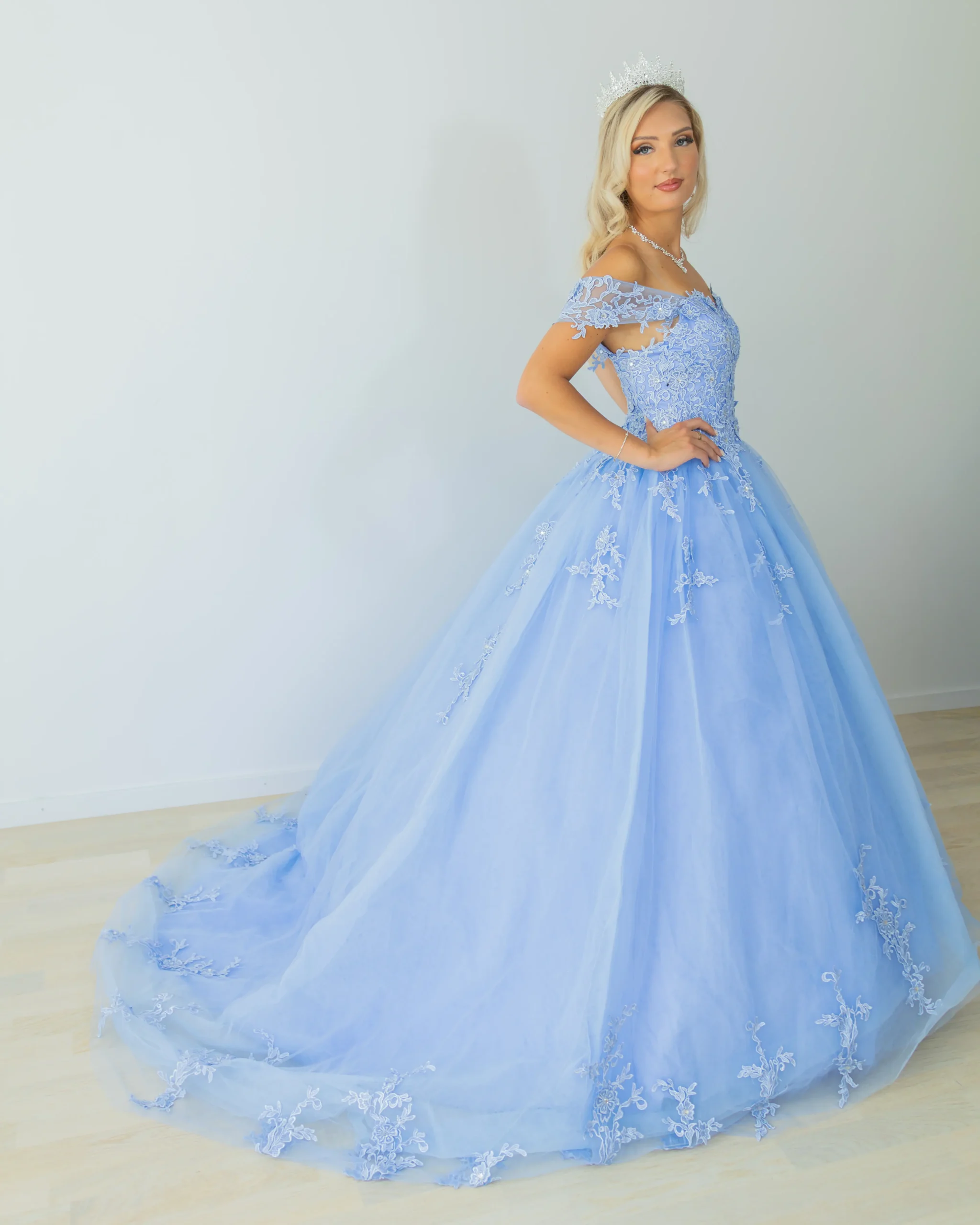 Lång quinceañera-klänning i himmelsblå nyans med romantiska spetsdetaljer och glittrande tyll. Den avskurna axelmodellen framhäver en mjuk och feminin siluett, perfekt för att lysa under din speciella dag.