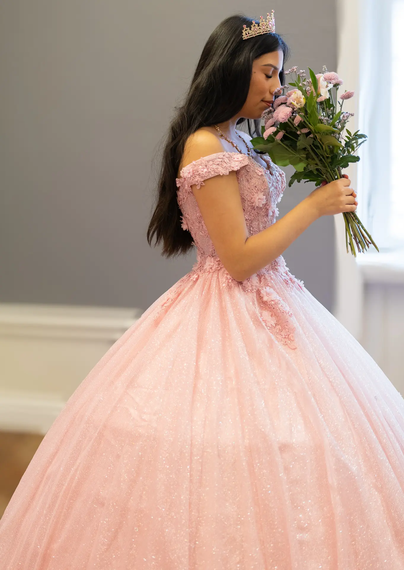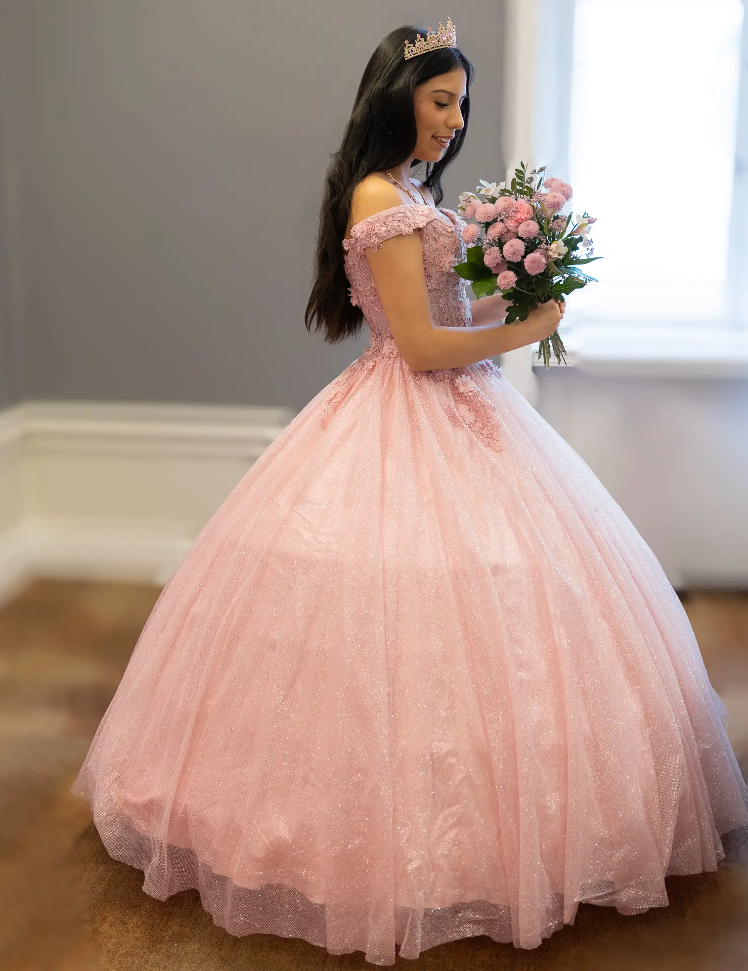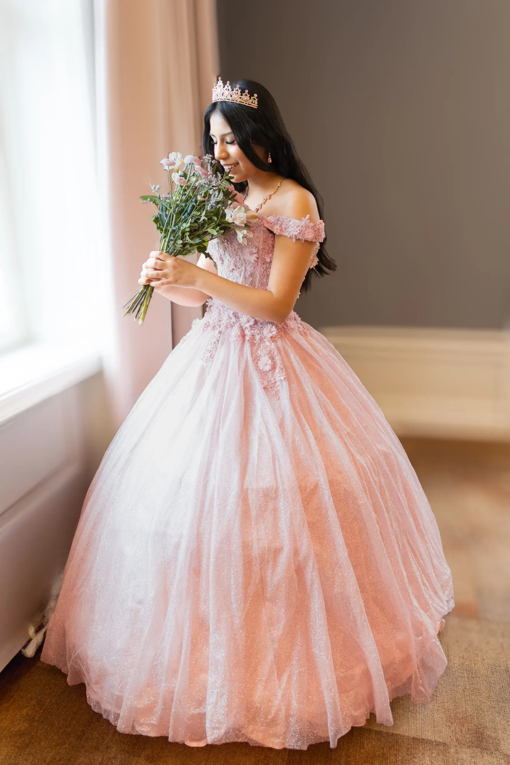 Lång aftonklänning i pastellrosa med vid kjol i glittrande tyll och figurnära liv med broderade detaljer. Den avskurna axelmodellen och den strukturerade korsetten framhäver figuren och ger en romantisk och sofistikerad känsla. Perfekt för quinceañeras, fotograferingar och lyxiga evenemang.